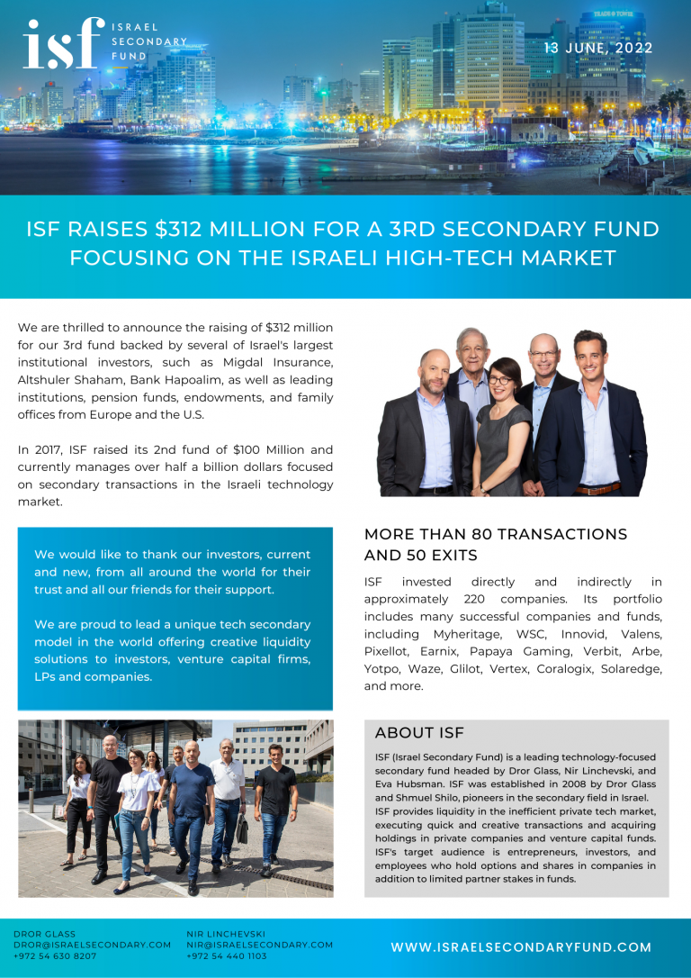 ISF provides secondary liquidity to Israel’s entire technology ecosystem. We purchase shares in start-ups from investors, founders and employees, acquire investor’s LP interests in VC funds and develop creative liquidity solutions for funds. ISF is leading the Israeli secondary market and serves as an essential building block to the long-term growth of the entire Israeli tech industry.